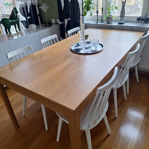 Formellt matsalsbord 190cm - 105cm, utdragbart till 290cm, med 6 stolar. Pris kan diskuteras. Matbord med sex matchande stolar i trä. Bordsskivan har en ljus träton och benen är vitmålade, liksom stolarna. Stolarna har sits i ljus träfärg och ryggstöd med kryssdesign. Passar som matgrupp i kök eller matsal. Bordet är rektangulärt och ger plats för sex sittplatser runt bordet.