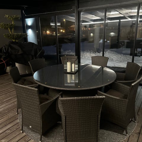 Matgrupp ute runt glasbord med 4 stolar metall rotting