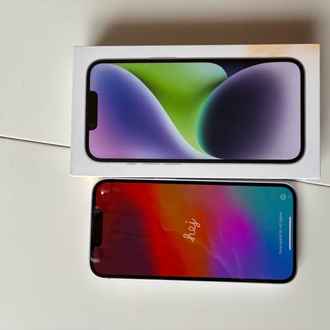 Apple iPhone 14 mobiltelefon med 128 GB internminne. Enheten visas här i en mörk/svart färg. Telefonen har dubbla bakre kameror, framåtvänd kamera i skärmen samt platt kantdesign. På bilderna syns även ett laddningsaggregat med kabel samt ett skal som kan ingå beroende på säljarens uppgift. Passar för användning med appar, surf, foto och vardaglig kommunikation. Exakta mått, skärmstorlek och övriga tekniska specifikationer följer Apples standard för iPhone 14-modellen.