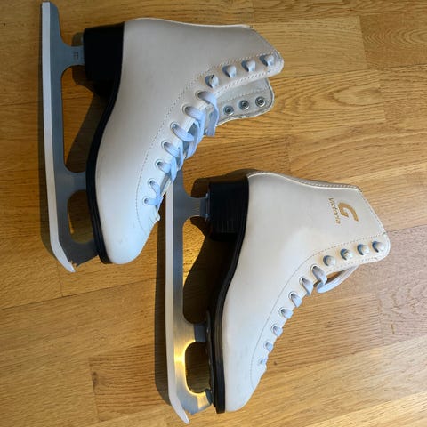 EDEA konståkningsskridskor för barn i storlek 225. Klassisk vit modell med snörning och brun klack. Skridskorna har tåtaggar framtill på skenan och är avsedda för konståkning eller annan skridskoåkning på is. Passar barn som behöver mindre skridskor för träning eller fritidsåkning inomhus eller utomhus på is.
