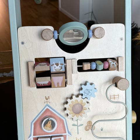 Gåvagn med inbyggda aktiviteter som stöder barnets kognitiva utveckling. Den funkar även bra för förvaring.