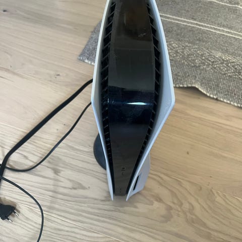 Säljer min Sony PlayStation 5 med DualSense-handkontroll. Den har en snygg svart/vit design med natur- och månmotiv.