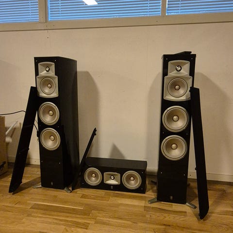 Yamaha RX-A840 förstärkare, med högtalarpaket i svart utförande. Systemet består av två fristående högtalare placerade på golv B&W 683 S2, och en centerhögtalare Dali Zensor Vokal, samt två väggmonterad bakre högtalare Dali Fazon och en separat subwoofer Energi.