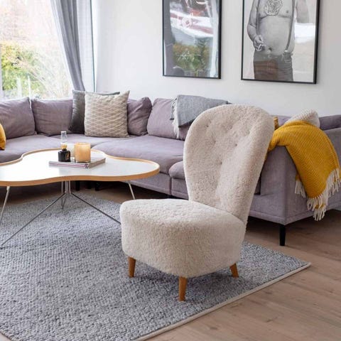 Nyrenoverad fårskinnsfåtölj. Fårskinn från Skandilock i färgen charcoal.