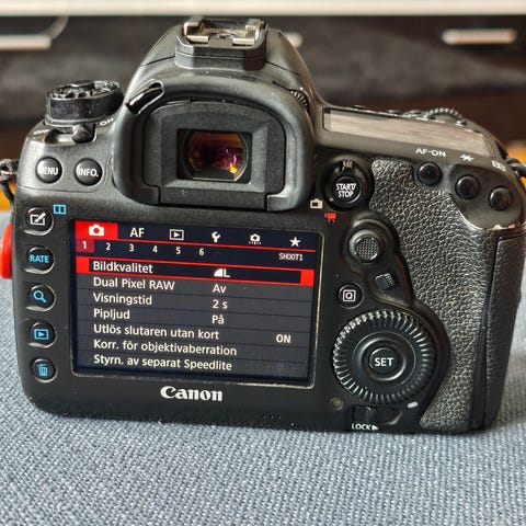 Canon EOS 5D Mark IV är bra använd skick. Kameran är en digital systemkamera med fullformatssensor. Den har en upplösning på 30,4 megapixlar och kan spela in video i 4K. Kameran har även inbyggd Wi-Fi och GPS-funktion.