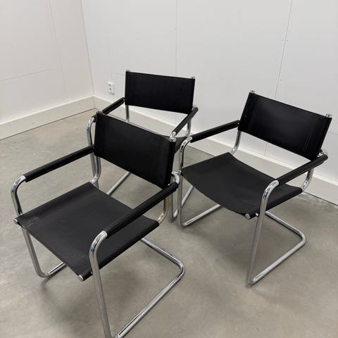 Skick: Begagnat men fullt funktionella. Flertal stolar är slitna i lädret vid ryggfästen och på armstöden. Detta påverkar inte hållbarheten men synen. Jag har påbörjat att fina till stolarna men har inte tid att fixa alla. Jag har dock svart konstläder och läderfärg som medföljer om du vill få stolarna att se ut som nya. Man överlappar de slitna delarna med nytt konstläder.