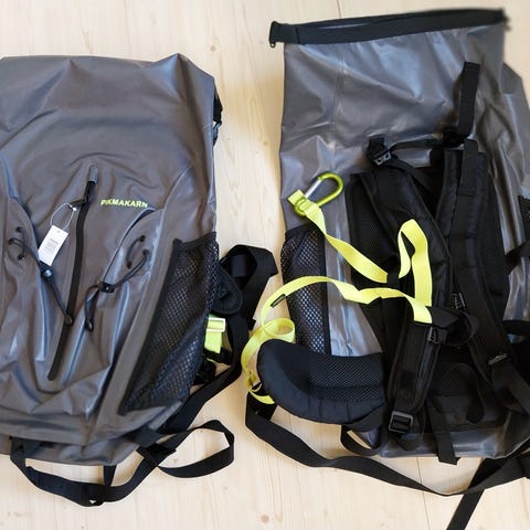 Tovek ryggsäck i flerfärgat tyg, lämplig för friluftsliv eller utflykter. På bilden syns även tillbehör som stav, skor och övrig utrustning som kan användas vid utomhusaktiviteter. Ryggsäcken har flera fack och remmar för packning. Passar för vuxna användare vid vandring eller annan utomhusbruk.