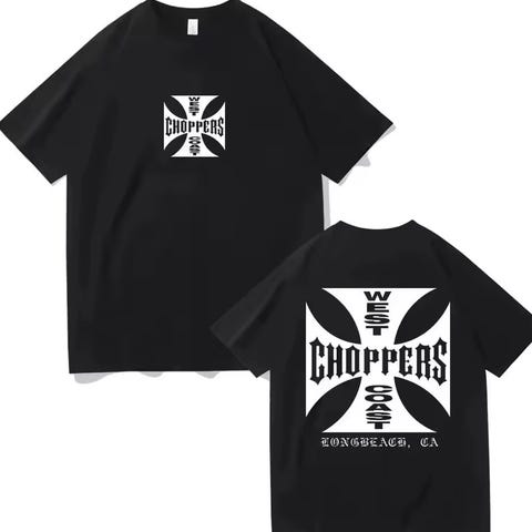 Svart t-shirt med tryck i 100 procent bomull. Framsidan har ett mindre tryck med texten ”WEST COAST CHOPPERS” och en järnkorssymbol. Baksidan har ett större tryck med samma text och symbol, samt texten ”LONG BEACH, CA”.