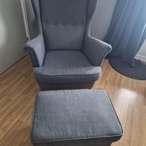 Två öronlappsfåtöljer med två stycken fotpallar i normal skick.