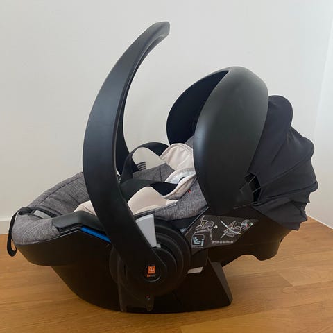 Köpt ny av oss januari 2025, hel och ren, fungerar felfritt. Basen fästs med Isofix och går att snurra. Babyskyddet går att fälla i liggläge.