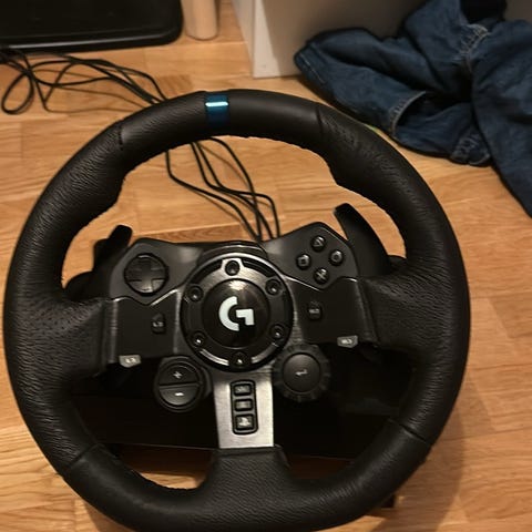 Logitech G923 racerratt med pedaler. Ratten har inbyggda knappar och växlingspaddlar samt är utrustad med force feedback-teknik. Pedalenheten har tre pedaler för gas, broms och koppling med metallplattor. Utrustningen ansluts med kabel. Lämplig för bil- och racingspel som stödjer Logitech G923.