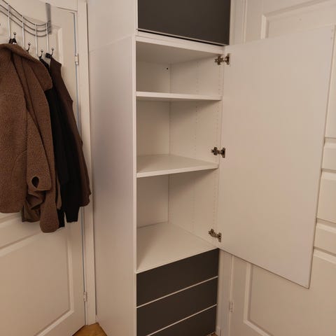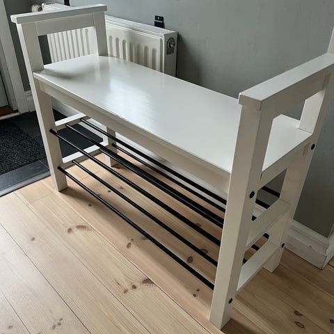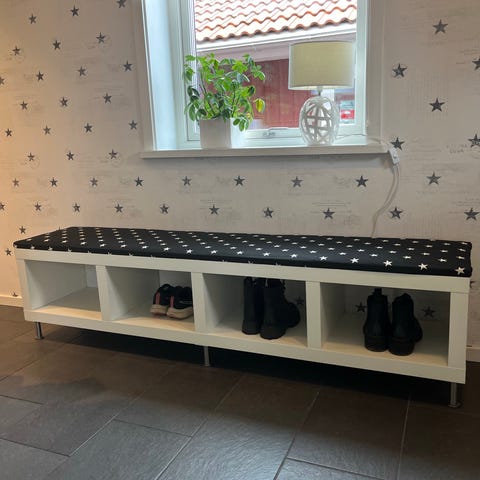 Jysk bänk med förvaring i vit stomme med tre svarta förvaringslådor/insatser. Ovansidan har en svart sittdyna som gör att möbeln kan användas både som sittbänk och förvaringsmöbel i till exempel hall, sovrum eller vardagsrum. Stommen är rektangulär och står direkt på golvet. Mått framgår delvis av bilderna med måttband, där höjden mäts från golv till ovansida på bänken. Möbeln är formgiven i en enkel, rak stil som passar in i många olika inredningar.
