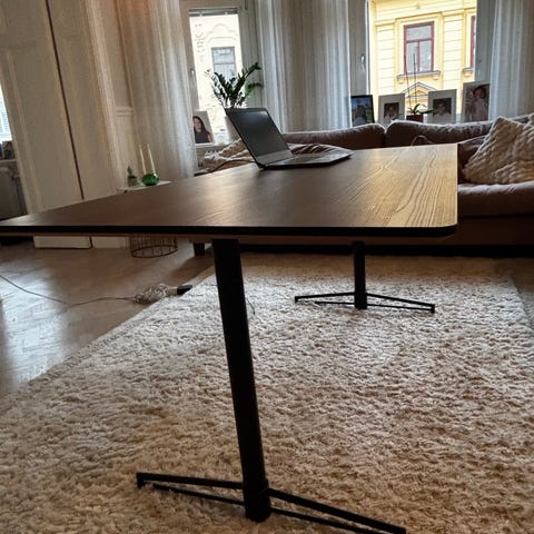 Ett ljusfärgat kontorsbord av god kvalitet. Mycket stabil och högjusterbar (inte elektrisk). Den har även en kabelbox på botten. Redan demonterad och klar för upphämtning.