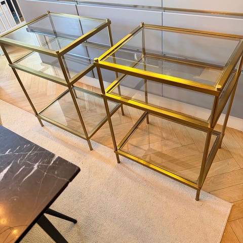Kromat stål och glasskiva marmormönster. 70 cm hög och 43 cm diameter.