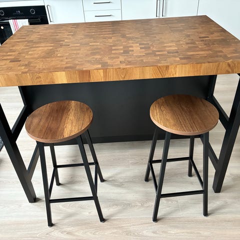Köksö från IKEA. lite skråmor i färgen(se bilder). Stolarna är lite rangliga. Enbart upphämtning då den väger en hel del. Priset är enbart för köksön, inte stolar