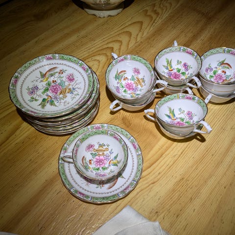 Serveringsfat i porslin med blåvit dekor. Ovalt fat med handtag i båda ändar och mönster med blommor och fåglar. Passar för servering av exempelvis kakor, smörgåsar eller andra rätter samt som dekorativt inslag på bord eller i vitrinskåp.