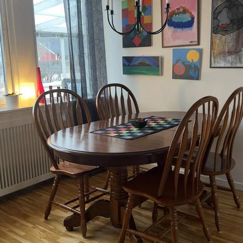 Bord GAMLARED från IKEA med två stolar STEFAN och stolsdyna JUSTINA.