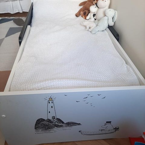 Säng med ihoppfällbar madrass, puff med förvaring på hjul samt bord med förvaring på hjul.