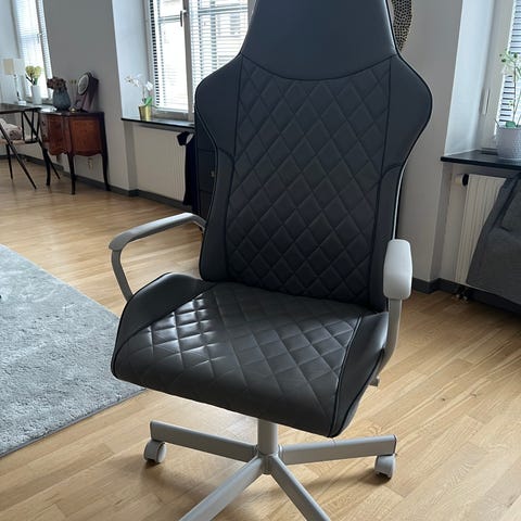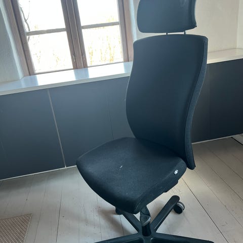 Kontorsstol VILGOT med hög rygg i svart mesh och röd sits. från Ikea. Stolen har femhjuligt kryssben i svart och justerbar sitthöjd. Passar för användning vid skrivbord eller arbetsplats i hem eller kontor.