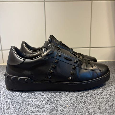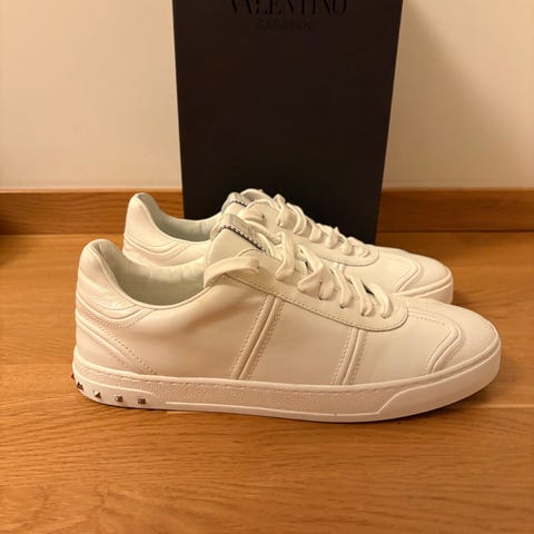 Valentino sneakers i storlek 43. Skorna har grön kamouflagefärg med detaljer i svart och beige. Snörning framtill och mönstrad sula. Ovandel i textil och syntet med nitar på hälen. Passar som vardagsskor eller fritidsskor.