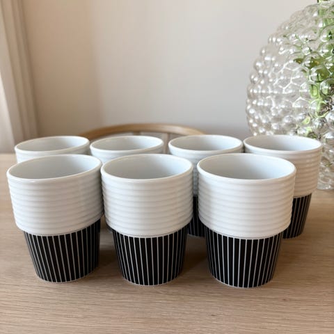 11 stycken Rörstrand Filippa K kaffe koppar. Kopparna är vita med ett mönster i beige/guld nertill.