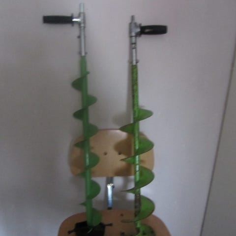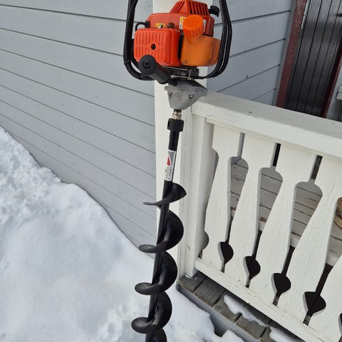 Manuell isborr i metall med vevhandtag. Finns I Sjöbo
