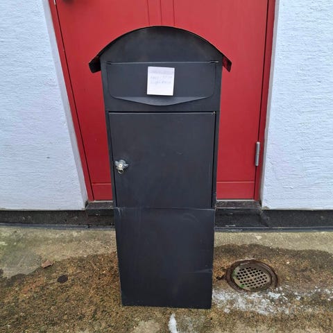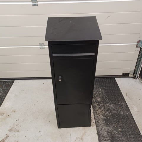 Stående postlåda i svart färg. Lådan har inkast upptill och dörr framtill för tömning. Avsedd för montering mot vägg eller fristående med lämpligt fäste. Passar för förvaring av daglig post och mindre försändelser utomhus.