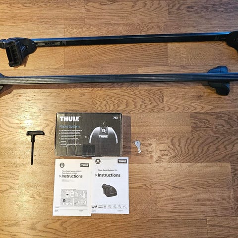 Thule Rapid System 753 takräcke i svart. Systemet består av två lasthållare med fötter anpassade för bilar med integrerade fästpunkter på taket. Takräcket är avsett för montering av exempelvis takbox, cykelhållare eller annan last enligt Thules anvisningar. Kontrollera kompatibilitet med bilmodell via Thules fit guide eller motsvarande dokumentation.