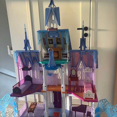 Vampirina dockhus i plast med flera våningar och rum. Huset är flerfärgat med lila, rosa, blå och orange detaljer samt inbyggda möbler och tillbehör som soffa, bord och andra inredningsdetaljer. Passar för lek med Vampirina dockor eller andra dockor i liknande storlek.