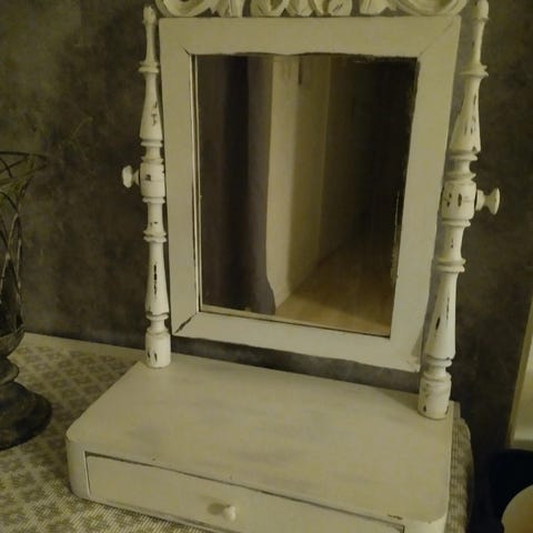 Vitmålat spegelskåp i lantlig shabby chic-stil med dekorativa detaljer och romantisk vintagekänsla.