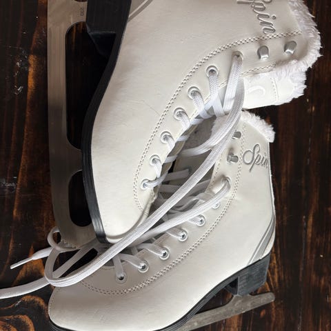 Spin skridskor för barn i storlek 36. Vita skridskor med snörning och fodrad insida för extra komfort. Passar för allmän åkning på is och annan fritidsåkning. Blad i metall med tåtagg framtill. Använda ett fåtal gånger.