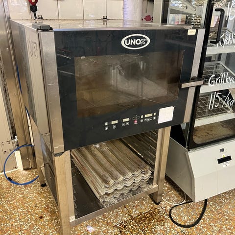 Unox ugn och Roundup korvvärmare i rostfritt stål. Ugnen är en elektrisk modell med glasdörr och digital panel framtill, lämplig för professionellt bruk i restaurang eller café. Under ugnen finns ett jässkåp. Plåtar 60X40 medföljer samt ventilationskåpa. Pris 28 000kr