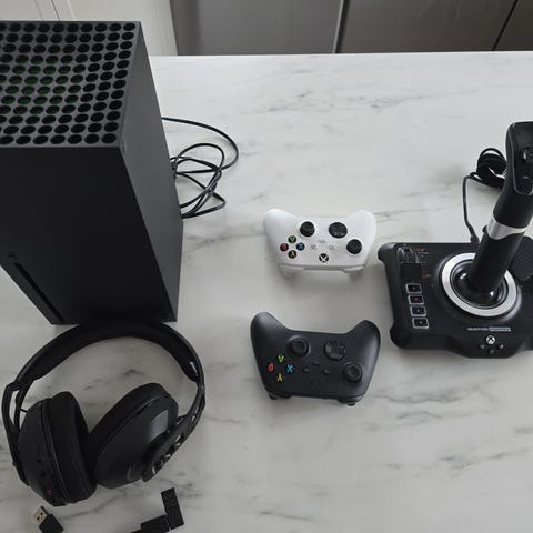 Microsoft Xbox Series X spelkonsol i nyskick. Två handkontroller, en laddningsdocka samt tillhörande kablar medföljer. LB knappen på den ena kontrollen glappar, allt övrigt fungerar utmärkt. Konsolen är fabriksåterställd och klar för sin nya ägare. Kvitto finns.