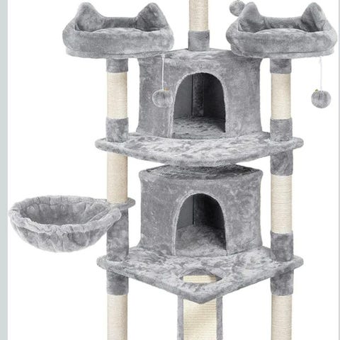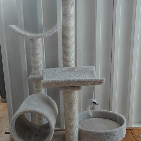 Katträd/klösträd i beige färg med flera liggplatser och klöspelare. Konstruktion i trä med stolpar lindade i naturmaterial för klösning. Övre plan med kantad liggplats, mellannivå med plattform och hängmatta samt en rund grotta med öppning. Bottenplatta ger stabilitet. Passar för inomhusbruk till en eller flera katter som behöver klösyta, vila och klättermöjlighet.