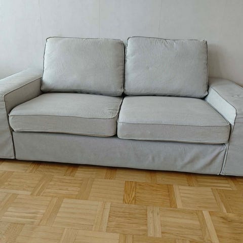 En vit tvåsitsig soffa. Liten men rimlig. Har några små fläckar men annars i bra skick!