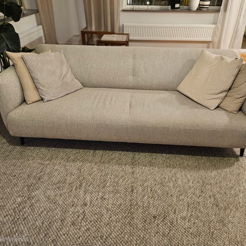 Soffa 3-sits i brunmelerat tyg. Breda armstöd och träben. Passar som vardagsrumssoffa eller extra sittplats i exempelvis gästrum eller allrum.