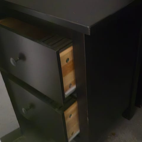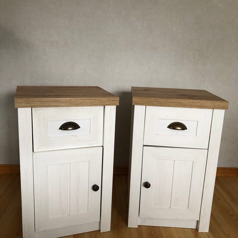 Två hemnes sängbord från Ikea. Renoverade med beige foliefilm på toppskivan (går att ta bort) och läder knoppar från Ikea. Något slitna (se bilder) men fungerar som dom ska. Originalknoppar till ett sängbord ingår. 600 kr för båda.