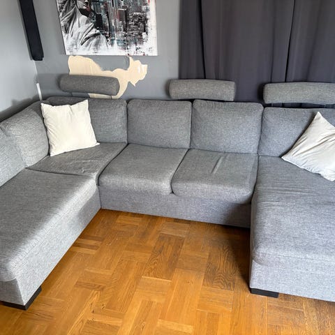 7-sitsig soffa i grått tyg från butiken MIO, 3 m bred, köpt 2015, gott skick, en mindre skada på en av kuddarna. Nypris 7.995:-, säljes för 2000:-, Hämtas i Segeltorp.