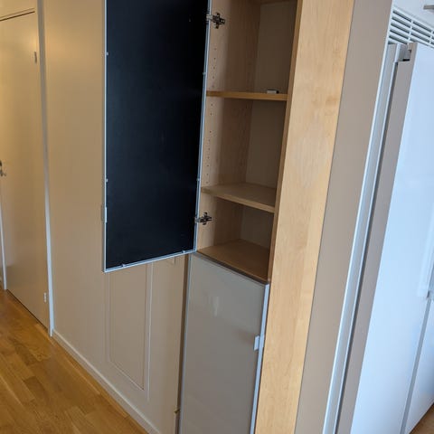 Högskåp från Ikea som använder vertikal yta till förvaring och tar liten plats.