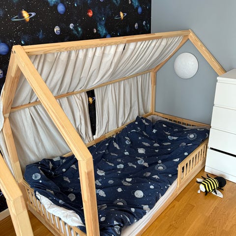 Två madrasser medföljer om så önskas. Även gardinerna på sängen kan följa med.