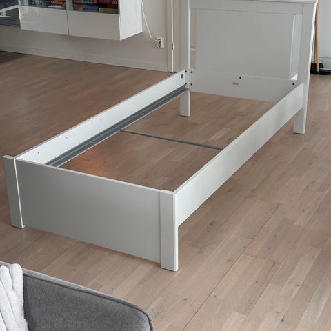 Sängram i vitt med ribbotten i trä.