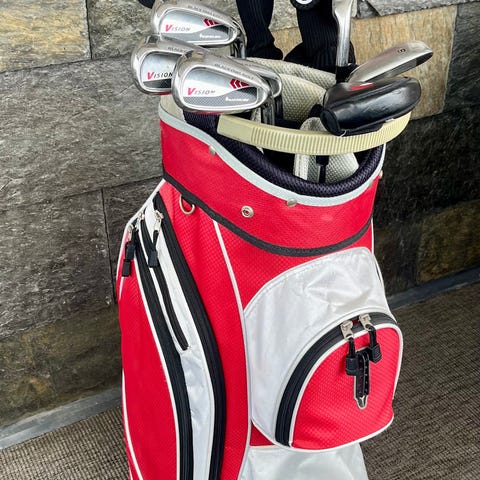Vagnbag röd och svart med mycket fack. Hybriden saknar röda headcover men skickar med ett i annan färg.