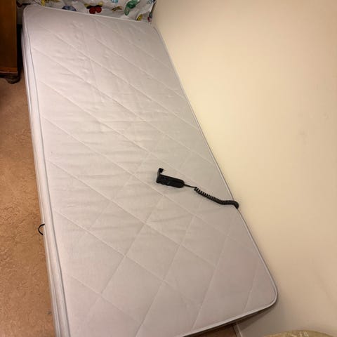 Ställbar säng 90x200 från Kinnabädden. Resårmadrassen är solkig och behöver bytas ut alternativt rengöras, men den ställbara motorn med fjärrkontroll fungerar utmärkt.