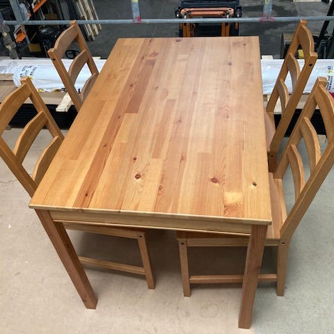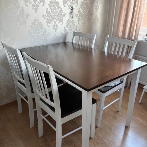 Matbord, 4 stolar och grön matta.