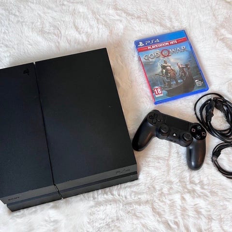 Playstation 4 med en dualshock 4 kontroll i fint skick, inklusive strömkabel och köpta spel på konsolen. Kan även skickas gratis på Vinteds app.