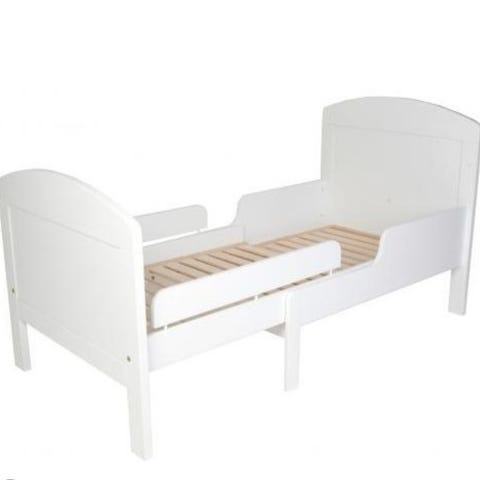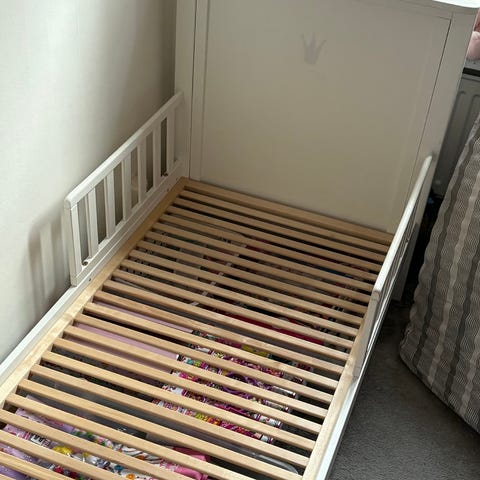 Troll juniorsäng Royal har populär design inspirerad av svenska kungahusets prinsessa Estelle. Utmed den höga, vackra sänggaveln är en stiliserad krona målad för hand. Väljer du en säng i klassiskt vitt är kronan målad i grått. För att förhindra att barnet faller ur sängen finns spjälor längst upp utmed långsidan.