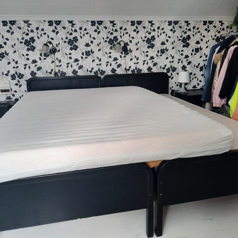Tempursäng ljusgrå med vit bäddmadrass i tempur 180x200 cm. Sängen består av två separata underdelar med ben och en gemensam bäddmadrass.