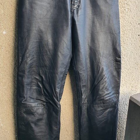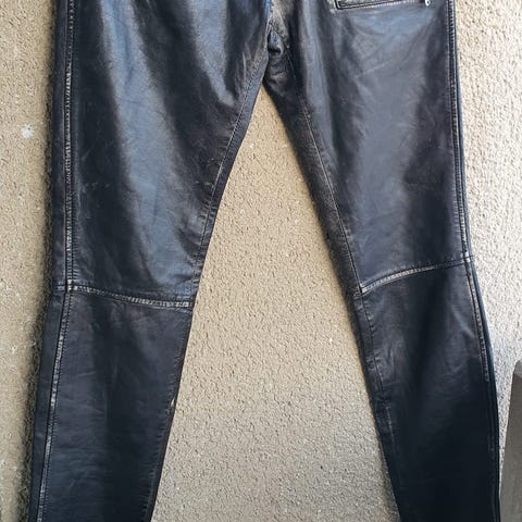 Svarta läderbyxor med dragkedja och knappstängning framtill. Byxorna har fickor fram och bak, samt dekorativa sömmar som framhäver passformen. En YKK-dragkedja säkerställer smidig funktion.