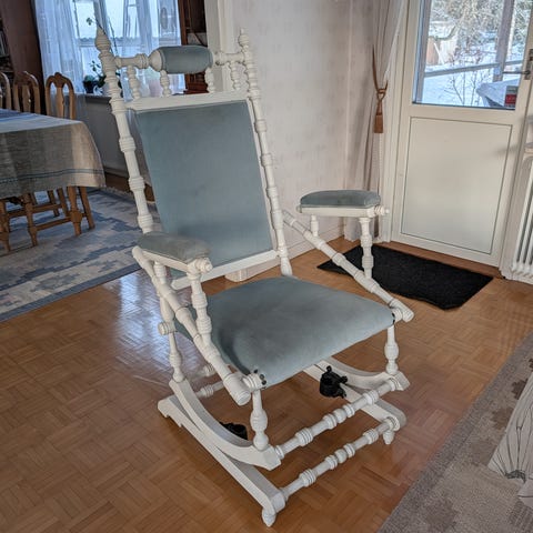 Gungstolen är i gott och stabilt skick. Det finns några få mindre färgskav på utsatta ställen