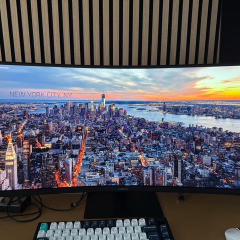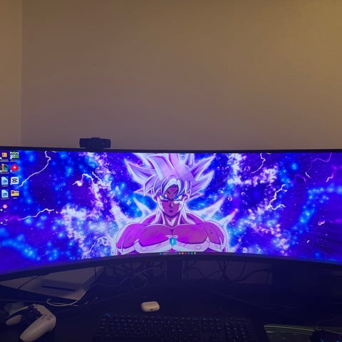 Otroligt panoramavy med massiv 57" ultrabred skärm — dubbla 4K-yta (Dual UHD) för maximal överblick och multitasking.
